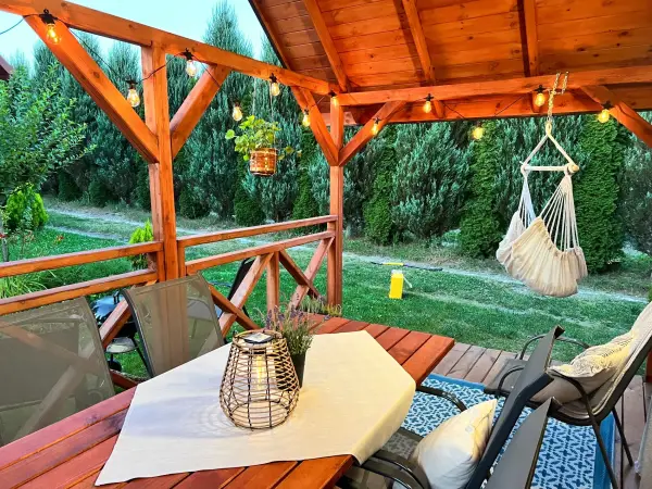 Każdy domek posiada dodatkowo prywatny taras wyposażony w meble ogrodowe oraz grilla.